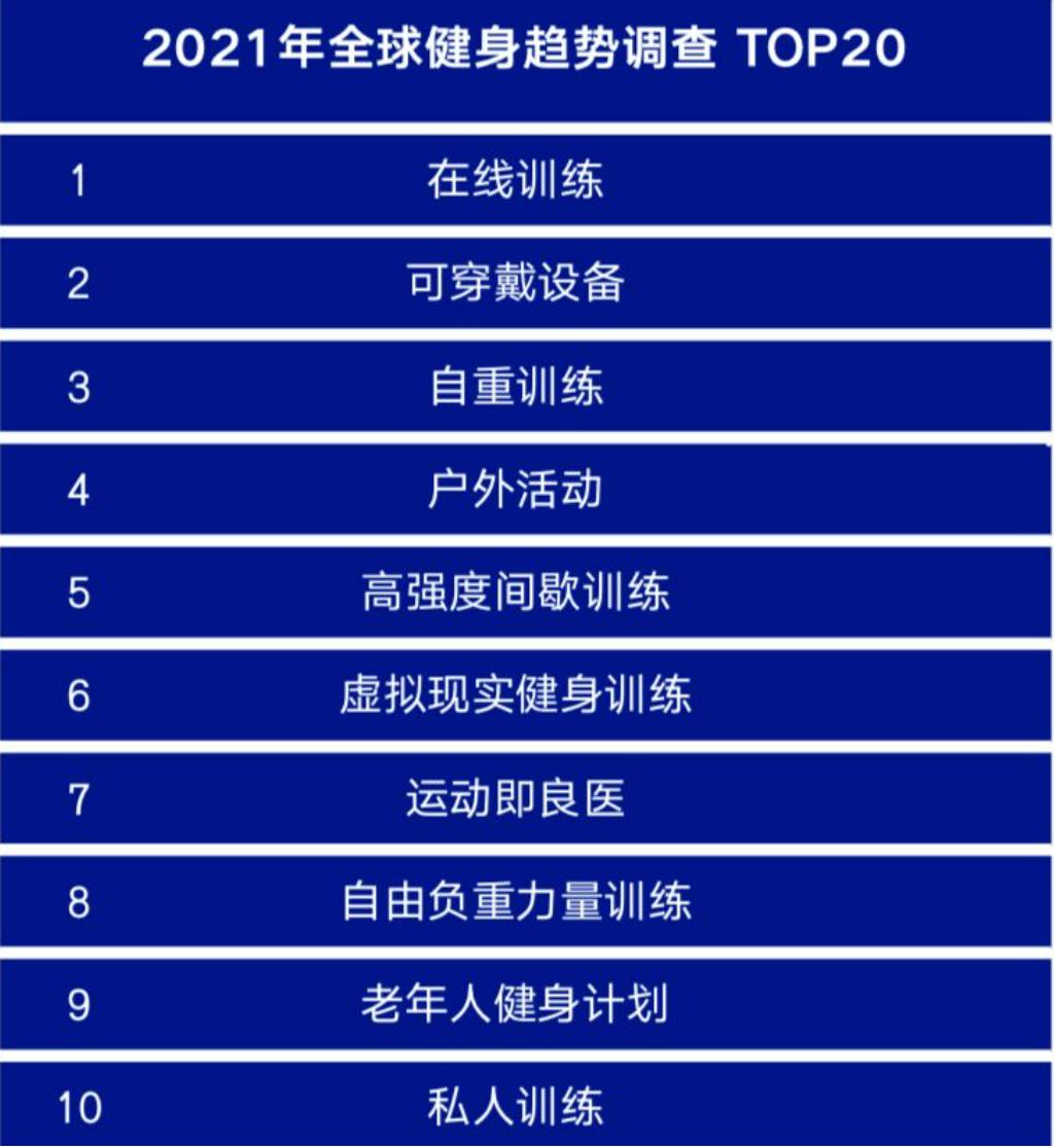 在 ACSM 和上海体育学院发布的《2021 年全球健身趋势调查报告》中,在线训练、可穿戴设备和自重训练排名前三,最传统的户外活动则被挤在三甲之外。此外,Top 20 里还有虚拟现实健身训练、移动设备运动 APP 的身影。