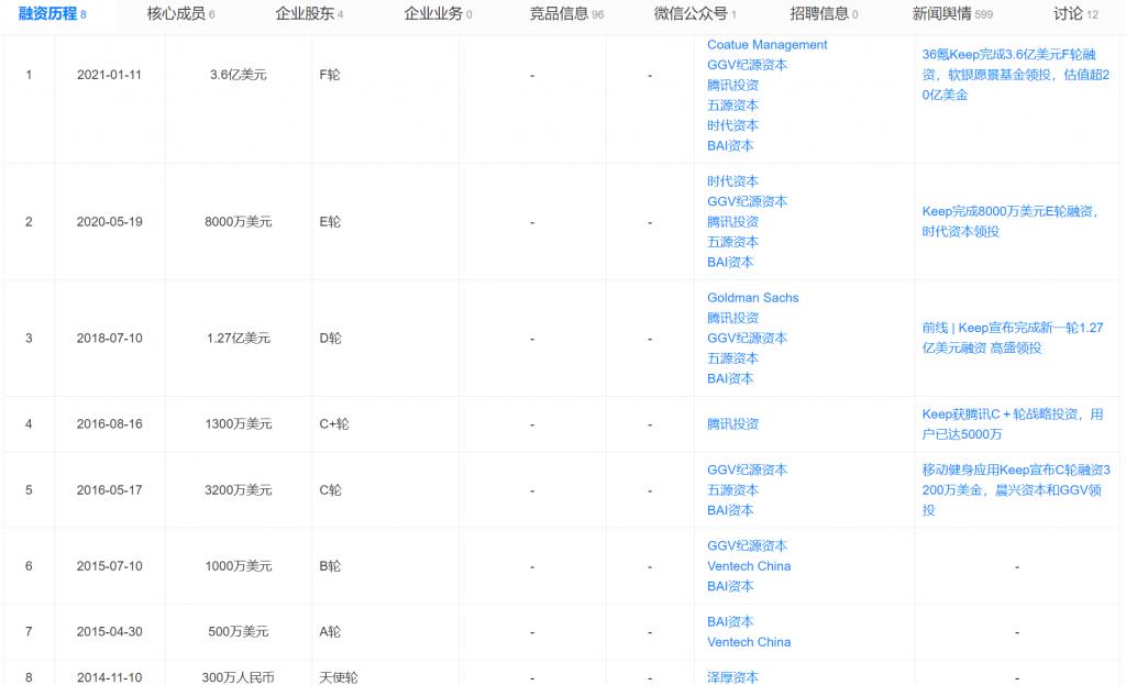 根据天眼查的数据,Keep 目前已经完成了 8 轮融资,最近一轮是在今年 1 月份完成的 F 轮 3.6 亿美元融资,投资方包括 Coatue Management、GGV 纪源资本、腾讯投资、时代资本、五源资本和 BAI 资本等大鳄。