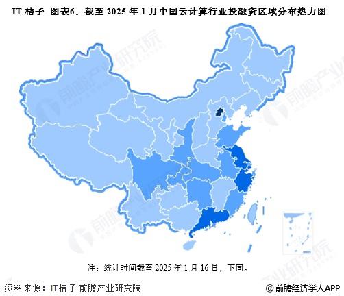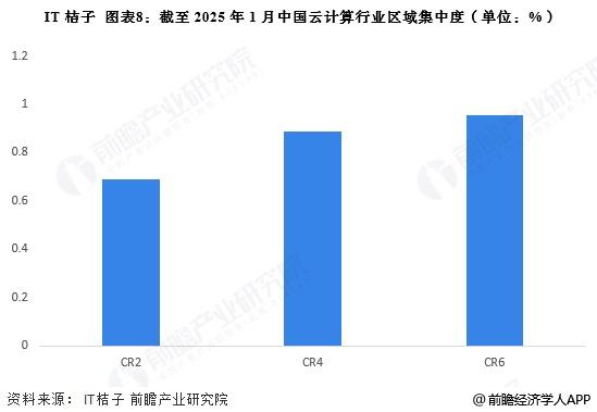 根据融资事件区域分布来看,中国区域集中度较高,截至 2025 年 1 月,中国云计算行业区域集中度 CR3 为 68.9%,CR5 为 88.75%,CR10 超过 95%,达到 95.45%。