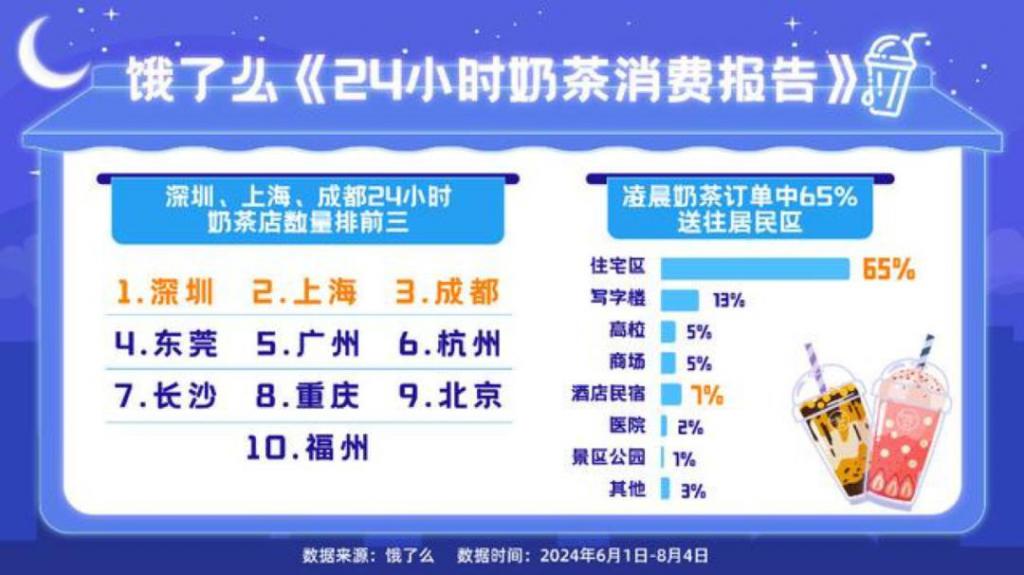 2024 年饿了么发布的《24 小时奶茶消费报告》显示,全国 24 小时营业的奶茶门店绝大多数集中在南方。通宵营业的茶饮门店数最多的城市依次是深圳、上海、成都、东莞、广州等地,广东三城市上榜前五,南方地区贡献了全国 90% 的 24 小时茶饮门店。在经济发达、夜生活丰富的南方城市,聚集了更多的年轻消费群体和常态化加班的 " 打工人 ",有着更大的夜间消费需求。