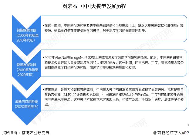 中国大模型发展经历了三个主要阶段。初期探索阶段 ( 2000 年代初至 2010 年代初 ) 主要集中在基础 AI 理论和小规模应用的研究,缺乏大规模数据和高性能计算资源。随着 2012 年深度学习的兴起,进入了快速发展阶段 ( 2010 年代初至 2020 年初 ) ,期间国内大企业如阿里巴巴、百度、腾讯和华为开始大力投资 AI 技术,推动了大模型技术的发展和应用。到了成熟与应用阶段 ( 2020 年初至今 ) ,中国在自然语言处理和计算机视觉等领域的大模型技术已达到国际先进水平,模型广泛应用于商业、医疗、法律等多个行业。展望未来,预计中国将进一步加强跨模态、多任务学习的应用,提升模型的透明度和安全性,巩固其在全球 AI 竞争中的地位。