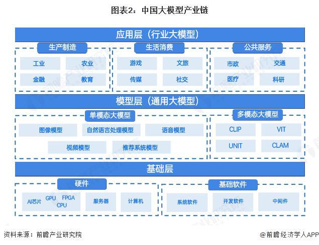 大模型产业链是一个庞大而复杂的系统,涵盖了从硬件设施到软件开发的各个环节,主要包括基础层、模型层和应用层。其中,基础层主要包括硬件和基础软件,模型层主要是通用大模型具体包括单模态大模型和多模态大模型,应用层则是指大模型结合行业的进一步升级应用形成的行业大模型,主要包括生产制造领域、生活消费领域和公共服务领域等。
