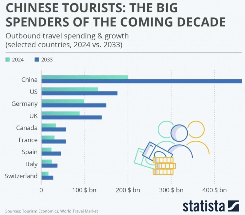 不止是出国搬砖,中国人也在涌向出境游,据 statista,中国已问鼎全球出境游最大支出国,且增长还在加速。