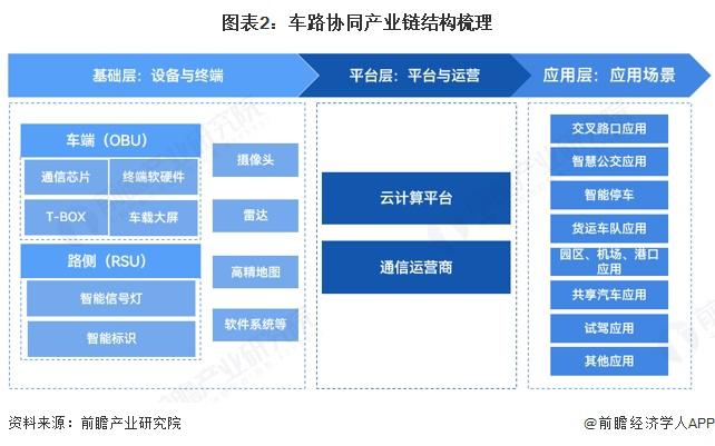 中国车路协同的产业链涉及到车载设备和智能交通系统、道路基础设施建设、数据处理和管理、服务提供商以及车辆制造和技术供应商等多个环节。这些环节需要相互协作和协同发展,以推动车路协同的实现和应用。将车路协同产业链分为基础层、平台层和应用层,分布领域广泛。其中基础层主要为设备与终端,主要包括芯片、摄像头、雷达、云计算、高精地图、软件系统等领域 ; 平台层主要为云计算平台与通信运营环节 ; 应用层主要为主要应用场景。