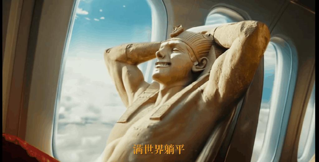 携程去年双 11 的 AI 广告片 " 满世界躺平的埃及法老 " 是很好的例子,把形象威严、神秘的埃及法老塑造成一个 " 逃出 " 金字塔在全球各大景点 " 躺平 " 的打工人,扑面而来的抽象感十分贴合年轻人审美喜好,并没有人关注片中法老的动作、表情是否自然,而是对这种极具反差感的创意津津乐道。