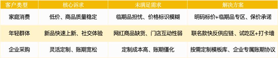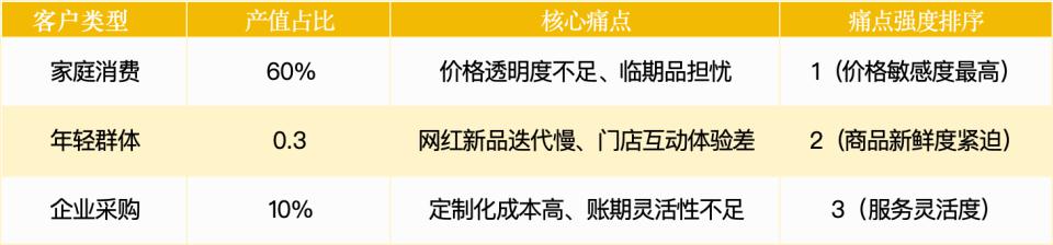 按痛点强度排序,家庭用户对价格敏感度最高(需强化价格公示),年轻群体对商品新鲜度需求紧迫(需缩短供应链响应),企业采购则关注服务灵活度(如专属折扣与标签定制)。