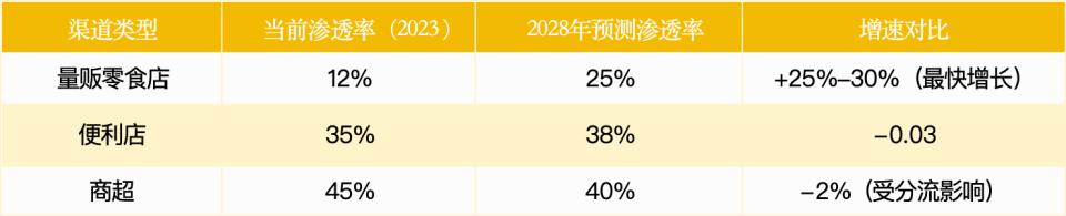 量贩零食店当前渗透率约 12% (按销售额计算),低于便利店(35%)和商超(45%),但增速领先。预计未来 5 年渗透率将提升至 25%,成为零食行业第三大渠道(仅次于商超、便利店)