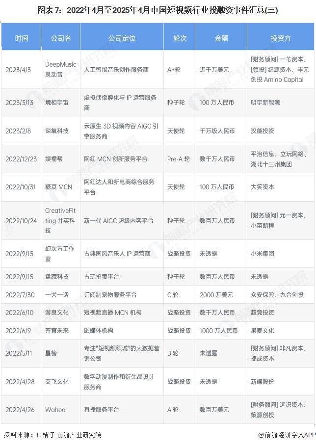 截至 2025 年 4 月,近三年短视频行业的主要投融资事件如下所示: