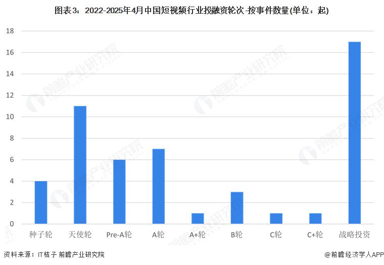 根据 IT 桔子数据库统计,2011 年来,我国短视频行业融资规模呈现先增长后降低的趋势,尤其在 2016-2018 年期间,中国短视频行业融资规模大幅上涨,许多短视频新品牌获得融资 ;2019 年来短视频行业在资本融资市场遇冷,2025 年截至 4 月 21 日,我国短视频行业仅发生 3 起融资。就融资事件数量和金额情况来看,近期我国短视频行业投融资热度有所下滑。