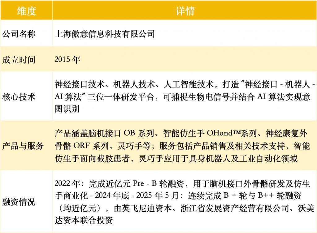 傲意科技旗下产品涵盖脑机接口 OB 系列、智能仿生手 OHand 系列、神经康复外骨骼 ORF 系列等。其智能仿生手主要面向截肢患者,帮助他们恢复手部功能;灵巧手则面向具身机器人及工业自动化领域,可完成高精度操作。