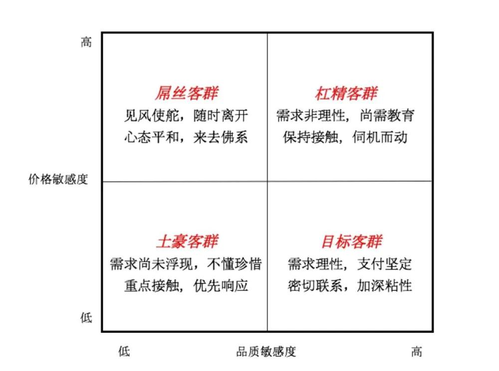 土豪客群——对价格不够敏感,对品质也无所谓,他们的需求尚未浮现,不会懂得产品的好,购买仅仅是因为有钱。面对这类客户,可以重点接触,当他们的真实需求浮现时,也要优先响应,毕竟他们是真有支付能力的。