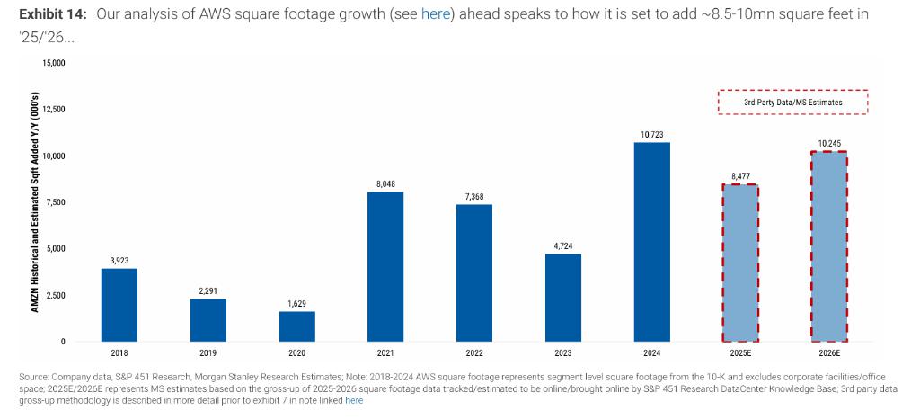 对于 AWS,报告分析了其数据中心建设步伐,预计 2025 年和 2026 年将新增大量数据中心面积,这为 2026 年实现 20% 以上的收入增长提供了物理基础,高于该行目前 19% 的基础预测。