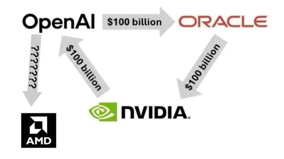 而甲骨文为支撑这一订单,需向英伟达采购 400-500 万块 GPU(价值约 1000 亿美元)。至此,形成了 " 英伟达→ OpenAI →甲骨文→英伟达 " 的资金循环链。