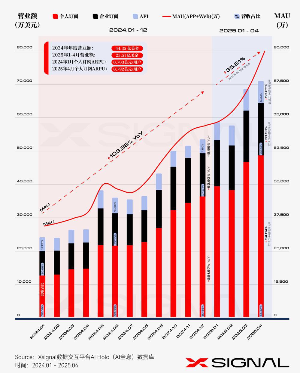 梳理过往 ChatGPT 的用户量增长情况来看,Xsignal AI Holo(AI 全息)数据库数据显示,自 2022 年 11 月发布到 2023 年 12 月,ChatGPT 的 MAU 突破 2 亿,在 2024 年度,MAU 继续从 3.2 亿激增至 6.5 亿,年度增长率高达 103.88%,在今年第一季度,ChatGPT 实现了 35.61% 的显著增长,MAU 接近 9 亿。