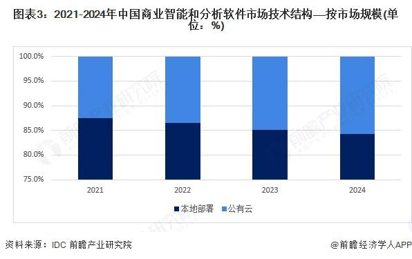 2021-2024 年中国商业智能和分析软件市场细分技术结构中,本地部署类占比从 2021 年的 87.5% 下降至 84.3%,公有云占比从 12.5% 上升至 15.7%。