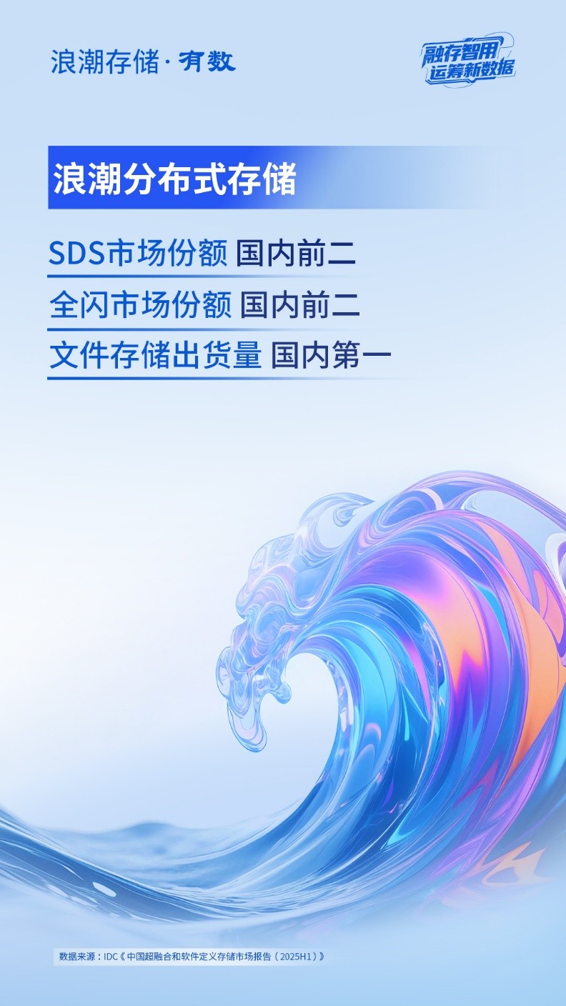 近日,国际权威调研机构IDC正式发布2025年上半年《中国超融合和软件定义存储市场报告》。报告显示,浪潮分布式存储实现同比增长8.1%,市场份额位居国内第二[1]; 全闪SDS市场份额位列国内第二[1],文件存储出货量排名国内第一[1]。