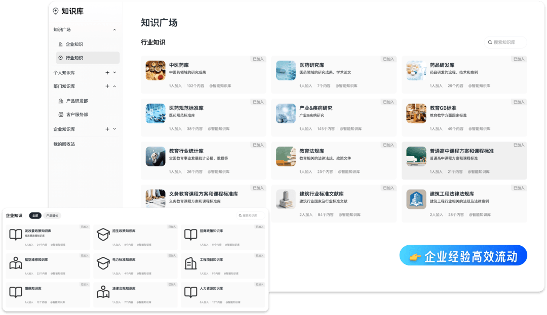 企业经验高效流动:产品专为企业打造专属知识广场,汇聚企业内各类知识库与行业知识库,系统地沉淀组织内的知识,把个体经验转化为组织“流动资产”,支持体系化沉淀、共享与再学习,让知识在内部高速循环并持续创造价值。