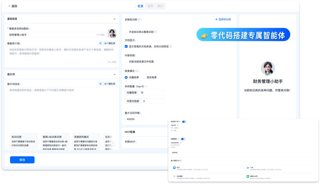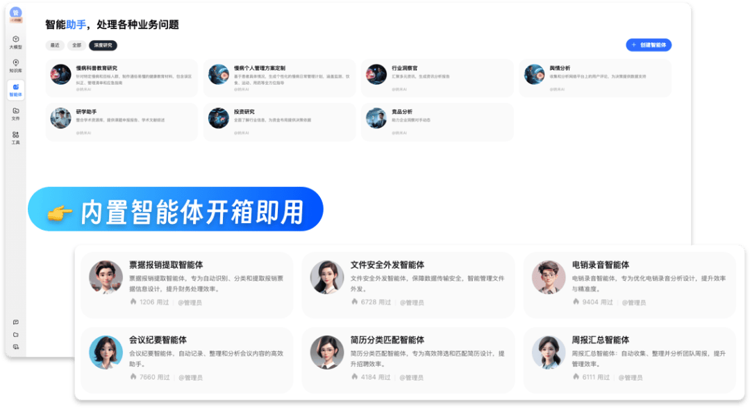 内置智能体开箱即用:360AI企业知识库产品内置6大知识智能体、5个深度研究智能体以及21个MCP服务,让企业跳过“从0到1开发AI能力”的复杂过程,直接迈入“从1到100快速复制场景价值”的阶段,加速AI在各行业的规模化应用。智能体具备丰富的互动形式,图文、网页、表单、图表,用户可以用各种不同形式与智能体互动。
