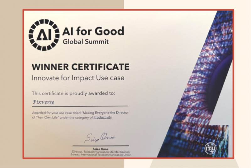 在 2025 年 7 月举办的联合国人工智能向善全球峰会(AI for Good Global Summit)上,爱诗科技旗下产品 PixVerse 亮相,其助力全球用户的创意实践成功入选“创新扩大影响案例集”,并获评“生产力”类别优秀案例。