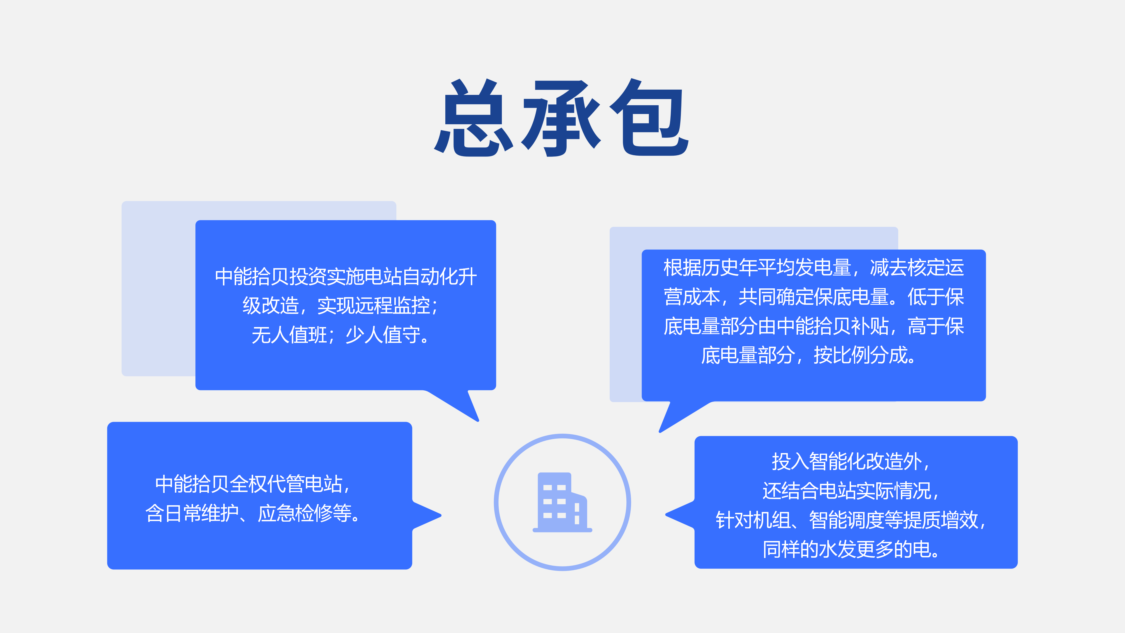在此背景下,中能拾贝依托20年水电领域的技术积淀,创新提出“智能化改造-集约化管理-物业化托管-总承包”的生态闭环解决方案,以“技术赋能+服务赋能”双轮驱动,为小水电行业高质量发展提供可复制的现代化转型范式。