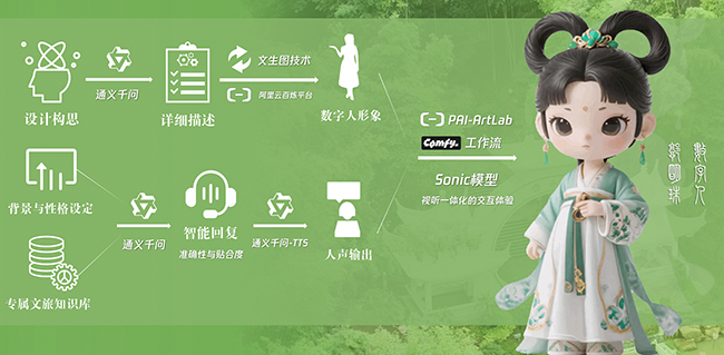 获得特等奖的齐鲁工业大学的参赛团队围绕遂川人文非遗、茶文化、自然风光三大元素,打造了遂川旅游形象IP设计。“我们通过对遂川县的深入调研,将本地文化元素融入在IP设计中,通过阿里云的PAI ArtLab平台上Stable Diffusion模型、lora模型等多个AI模型,多次调试来生成最佳的效果;同时打造了遂川旅游IP形象互动AI智能体,调用阿里云通义大模型,实现遂川旅游IP智能可视化交互。我们希望通过现代设计语言实现传统与潮流的对话,吸引Z世代年轻人来到遂川,爱上遂川。 ”