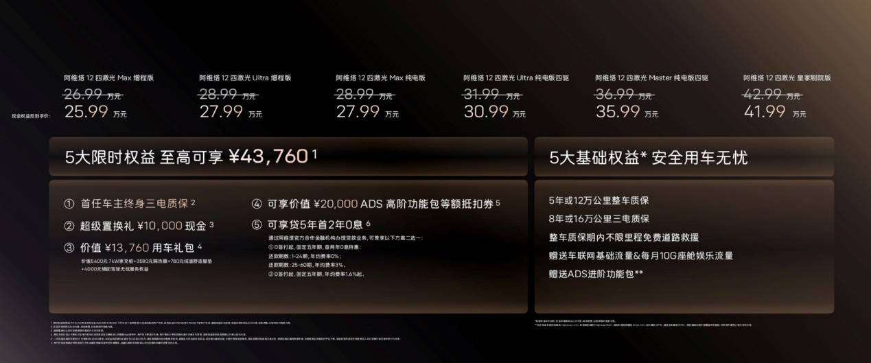 2025年10月28日,阿维塔12四激光版正式上市,官方指导价为26.99万元-42.99万元,权益后到手价为25.99万元-41.99万元。华为常务董事、终端BG董事长余承东现身发布会,彰显了华为和阿维塔战略合作的深度与高度。作为“最美华系车”的标杆力作,阿维塔12四激光版凝聚华为智能科技,不仅全系升级了华为乾崑四激光与华为乾崑智驾ADS 4,更以全新曦金灰色外观以及岩棕色内饰诠释了未来美学的深刻内涵,在30万级智能轿车市场树立起智美豪华新标准。