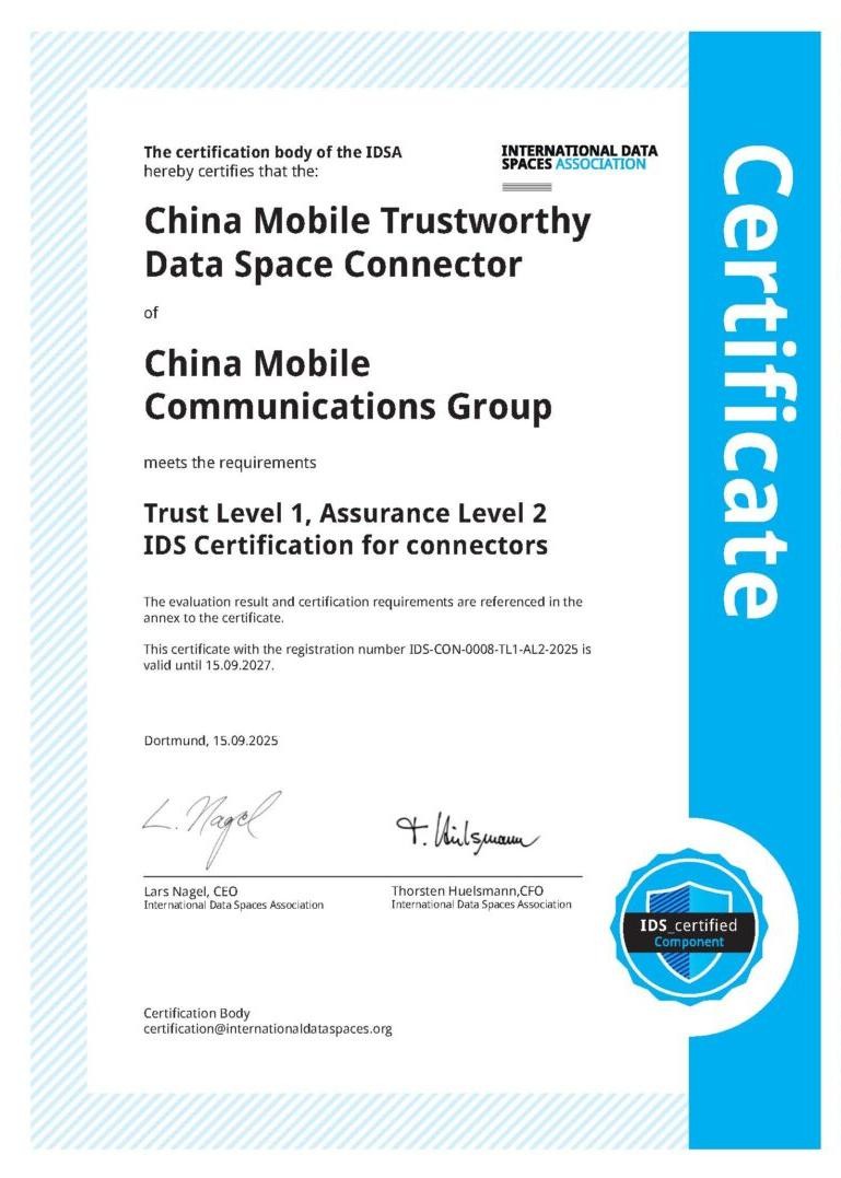 近日,中国移动可信数据空间连接器在下一代互联网国家工程中心-IDS数据空间测试认证实验室顺利通过评估,获得了由国际数据空间协会(IDSA)颁发的国际数据空间(IDS)组件认证。该成果标志着产品在技术合规性、安全性与国际互操作性上符合了国际要求,实现了与国际数据空间标准的全面对齐,同时还为国内数据空间生态的标准化建设提供了关键实践标杆。
