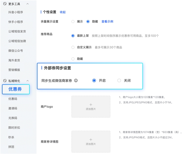 商家在小鹅通后台创建通用优惠券时,只需开启“同步生成微信商家券”配置项,即可一次性生成可在微信生态内分发的商家券。系统会自动校验店铺是否绑定微信小程序并授权微信摇一摇账户,确保功能顺利使用。