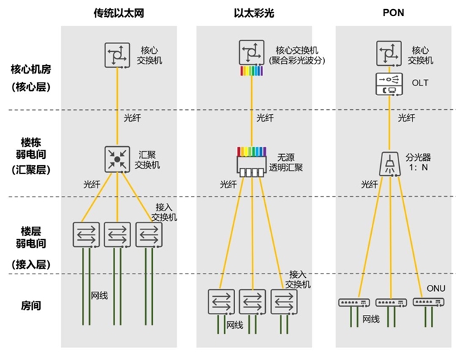 以太彩光方案中,每个接入交换机分配一个独立的、专属的波长,接入交换机到汇聚交换机是独享带宽,不存在争抢,而且时延也更低。