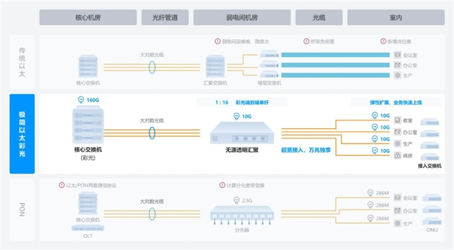 在维护性、扩展性、兼容性等各方面,以太彩光方案也比传统以太网方案和PON方案更有优势。