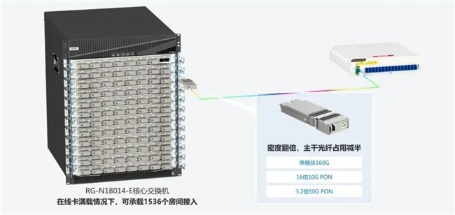 以锐捷RG-N18014-E核心交换机为例,在线卡满载的情况下,一个设备就可以承载1536个房间的接入(设备有96个端口,每个端口16个接入,96×16=1536),足以满足绝大部分学校、医院、企业的需求。