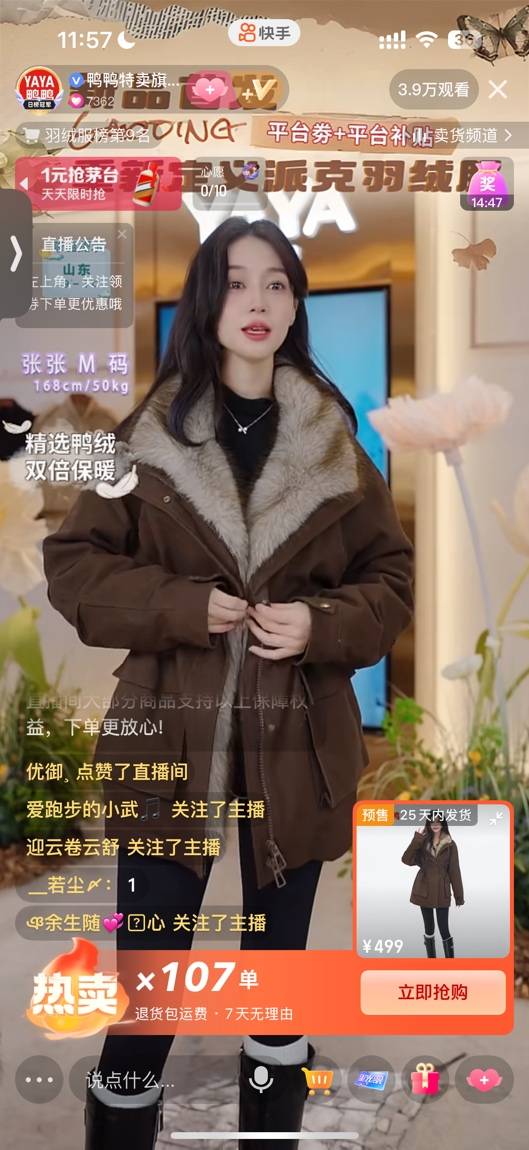 有了前期达人蓄水破局,2021年9月品牌开启自播后,仅用2个月时间便实现单月GMV破亿,成为快手品牌自播成绩跃升最快的黑马品牌之一。2022年1月,快手年货节期间鸭鸭销售成绩再创新高,日GMV达3200万……从牛刀初试到实现品牌声量和销量双突破,鸭鸭通过在快手的持续深耕,不断融入平台商业生态。