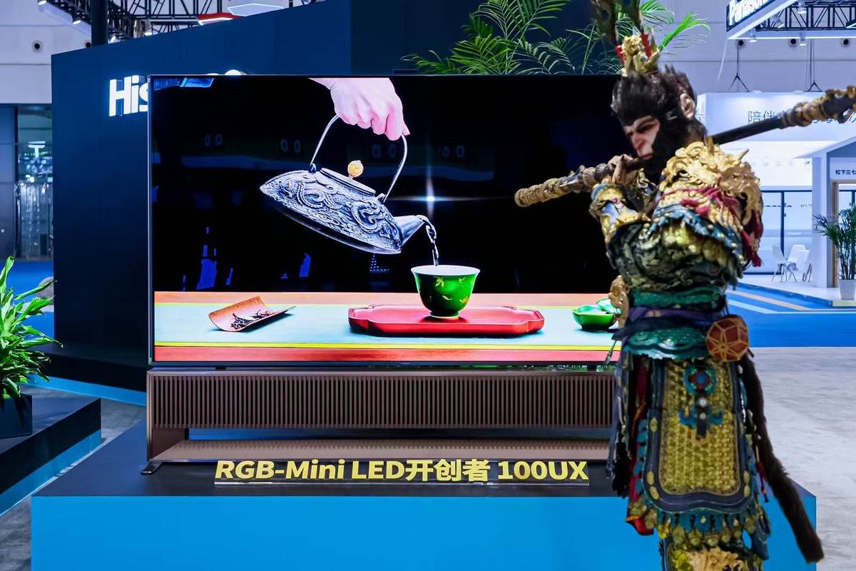 例如在芯片领域,目前海信100吋电视全面搭载了新一代自研信芯AI画质芯片。以信芯AI画质芯片H7为例,这是全球首颗实现光色同控的芯片,首创RGB光色同控算法,实现3×26bits光色精控和15680点的高精色彩控制,为大屏带来更加细腻的像素级画质表现。此外在屏幕领域,海信电视首创极黑抗反屏幕——黑曜屏Ultra,凭借行业唯一搭载内外双层纳米级低反技术,加矩阵式设计多层偏光片,历经数万次调校实现1.28%超低反射率,并且黑度领先普通屏幕4倍;同时,在控光能力上,海信电视迭代了全新U+Mini LED光晕控制系统,通过独有的聚光透镜、点阵排布和控光算法,实现了全链路像素级精准控光。