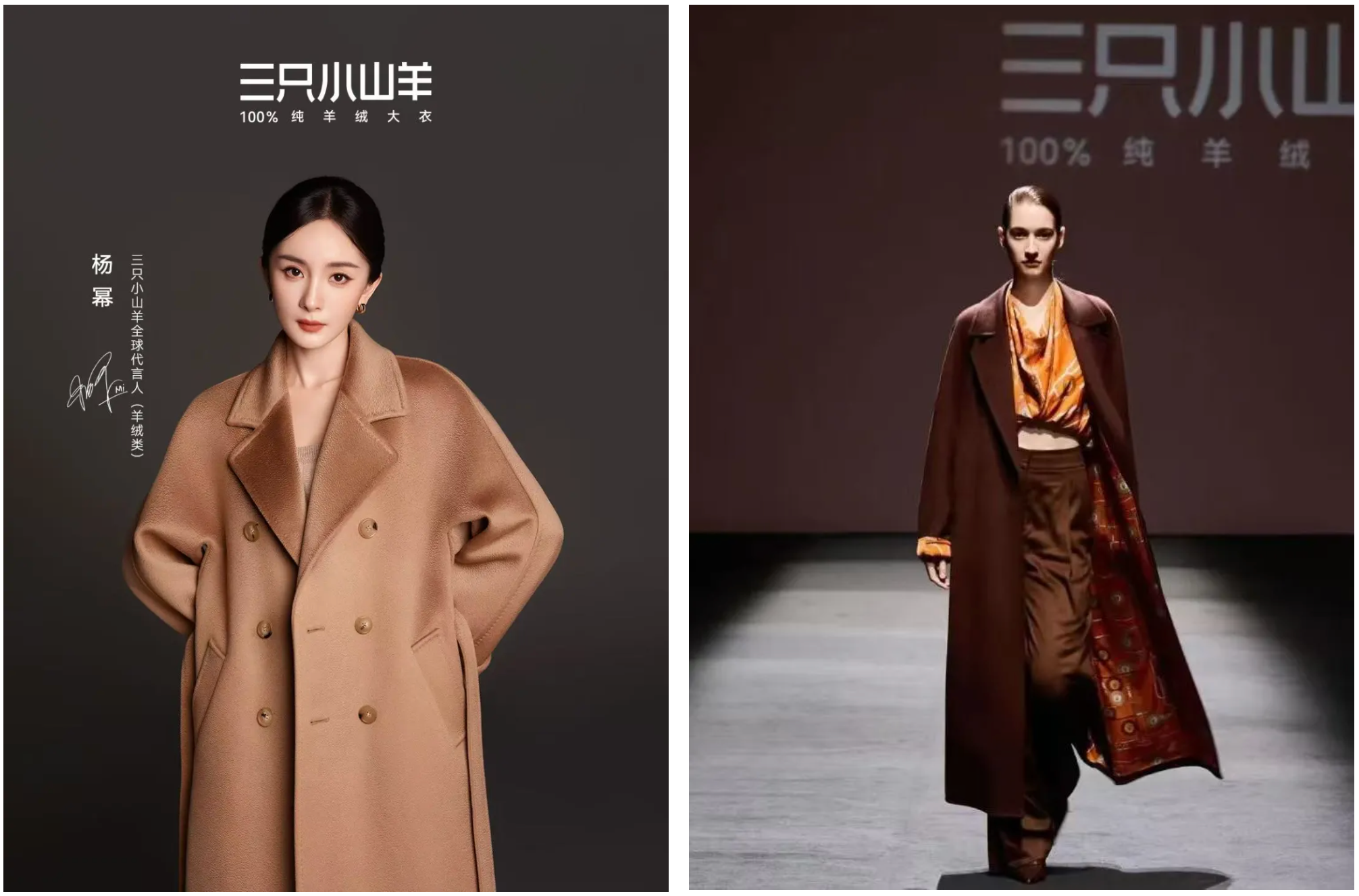 在产品与设计上,三只小山羊明确提出“只做100%纯羊绒大衣”的定位。品牌长期使用来自西藏阿里地区海拔约4,500米的小山羊细绒,纤维细度控制在14.5微米以内,每件大衣约需取材自58只12个月内幼羊。这种严苛标准,决定了品牌在面料上的差异化起点。通过与前 Hermès 设计师 LaraCostafreda合作推出大秀「三生万物·绒耀新生」,将东方哲思与西方美学结合,用羊绒与真丝、功能面料混搭的手法,呈现出自然与现代交织的轻奢风格。这场大秀不止是一次品牌曝光,更标志着国产羊绒品牌在国际审美语境下发声。