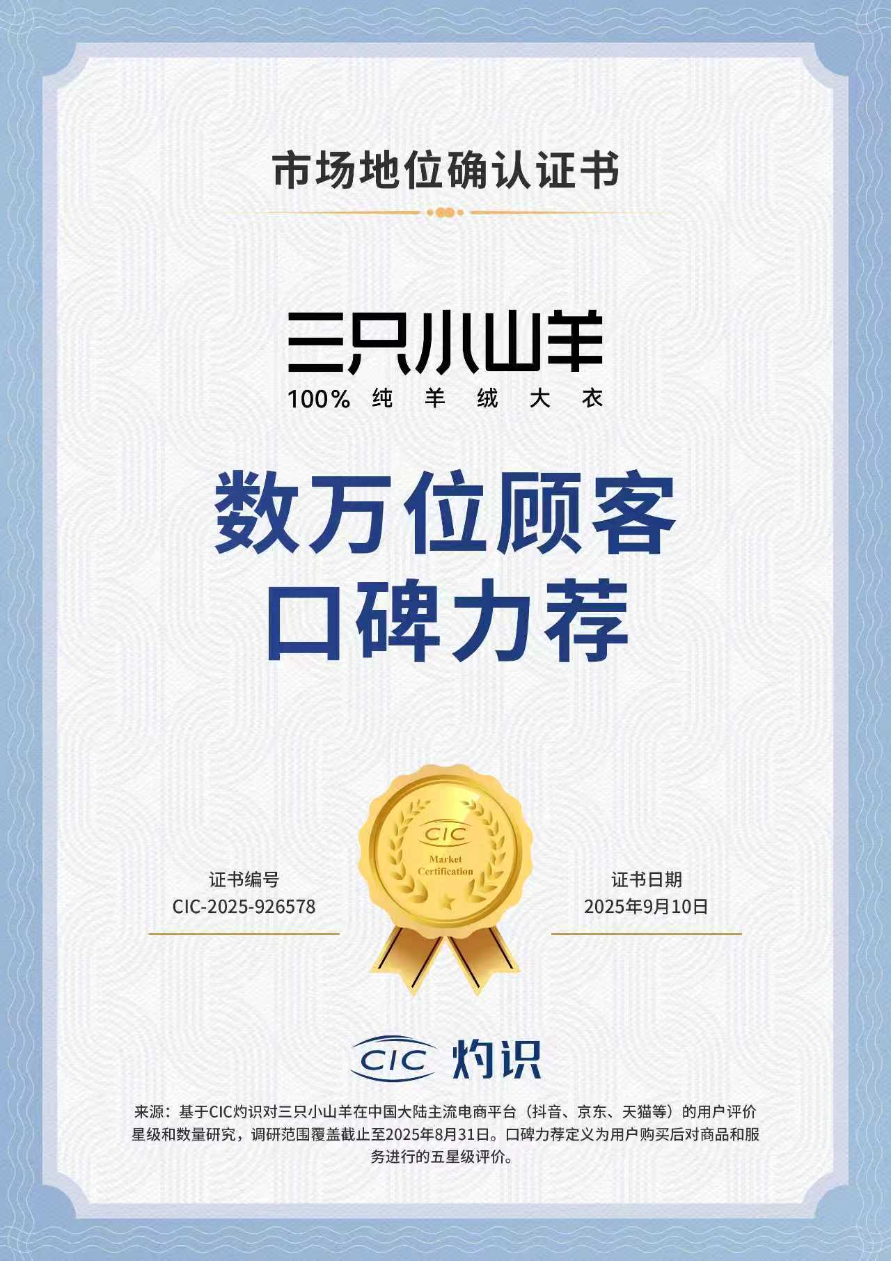 在2025年9月期间,CIC灼识采用科学、严谨的统计与分析方法,对中国大陆羊绒大衣行业开展了深度调研和专项的系统性研究。基于对三只小山羊在中国大陆主流电商平台(抖音、京东、天猫等)的用户评价星级和数量研究的详尽调研与深度分析,CIC灼识确认三只小山羊“数万位顾客口碑力荐”的市场地位。