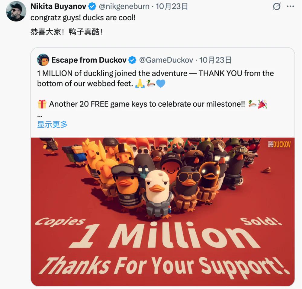 从销售成绩来看," 风口上的鸭子 " 也卖疯了:《逃离鸭科夫》在 Steam 前两周优惠售价 51.04 元,按照 12 天爆卖 200 万份的速度,销售额已超 1 亿元——就连《逃离塔科夫》制作人 Nikita Buyanov 都在转发《逃离鸭科夫》的动态,并给予 "ducks are cool" 的肯定。