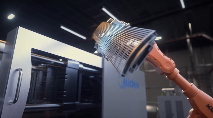 这种看似“返璞归真”的设计背后,是多项关键工艺的硬核支撑:为打造一米四长的弧形格栅曲面,美的采用五轴曲面精密加工工艺,将格栅精度控制在0.01毫米(相当于头发丝的十分之一),确保气流通过时的顺滑度;而1000吨级电动注塑机的引入,则彻底解决了大尺寸曲面部件易变形的行业难题,保障了送风结构的长期稳定性。