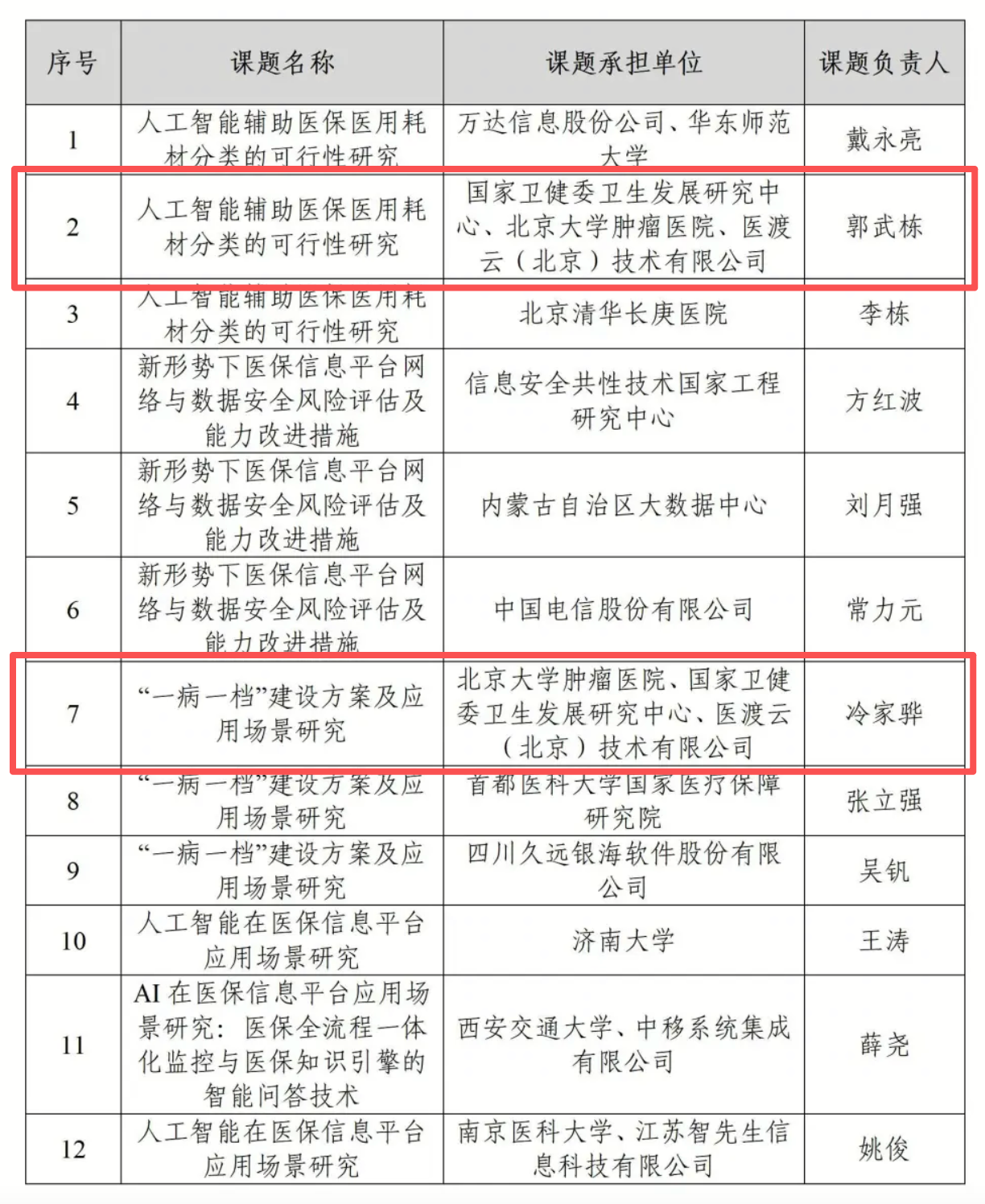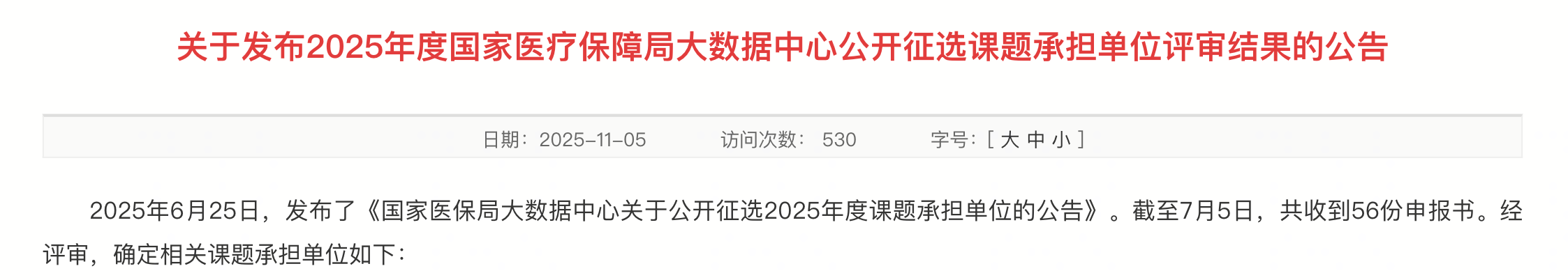 11月5日,国家医疗保障局大数据中心正式公布2025年度课题承担单位名单。医渡科技联合国家卫健委卫生发展研究中心、北京大学肿瘤医院共同申报的《人工智能辅助医保医用耗材分类的可行性研究》与《“一病一档”建设方案及应用场景研究》2项课题,在激烈评选中双双高分中标。