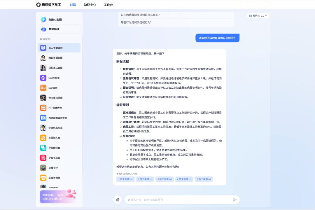 依托企业上传的薪酬架构、管理制度、员工手册等核心知识库,本专利技术支撑的员工服务系统实现认知连贯性交互,提供政策精准解读与高效管理全周期服务支持。