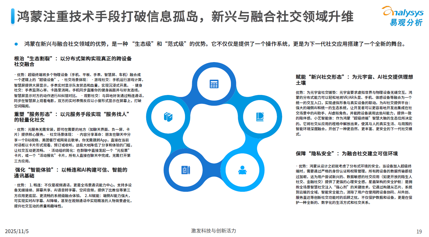 以社交通讯为例,报告特别指出,「新兴与融合社交」领域是一个潜力巨大的新兴市场。鸿蒙可以利用技术手段打破信息孤岛,以分布式架构实现跨设备社交融合(如游戏、健身、观影社交);以元服务实现「服务找人」的轻量化社交;以 AI 构建智能通讯基础,为元宇宙、AI 社交提供理想土壤。