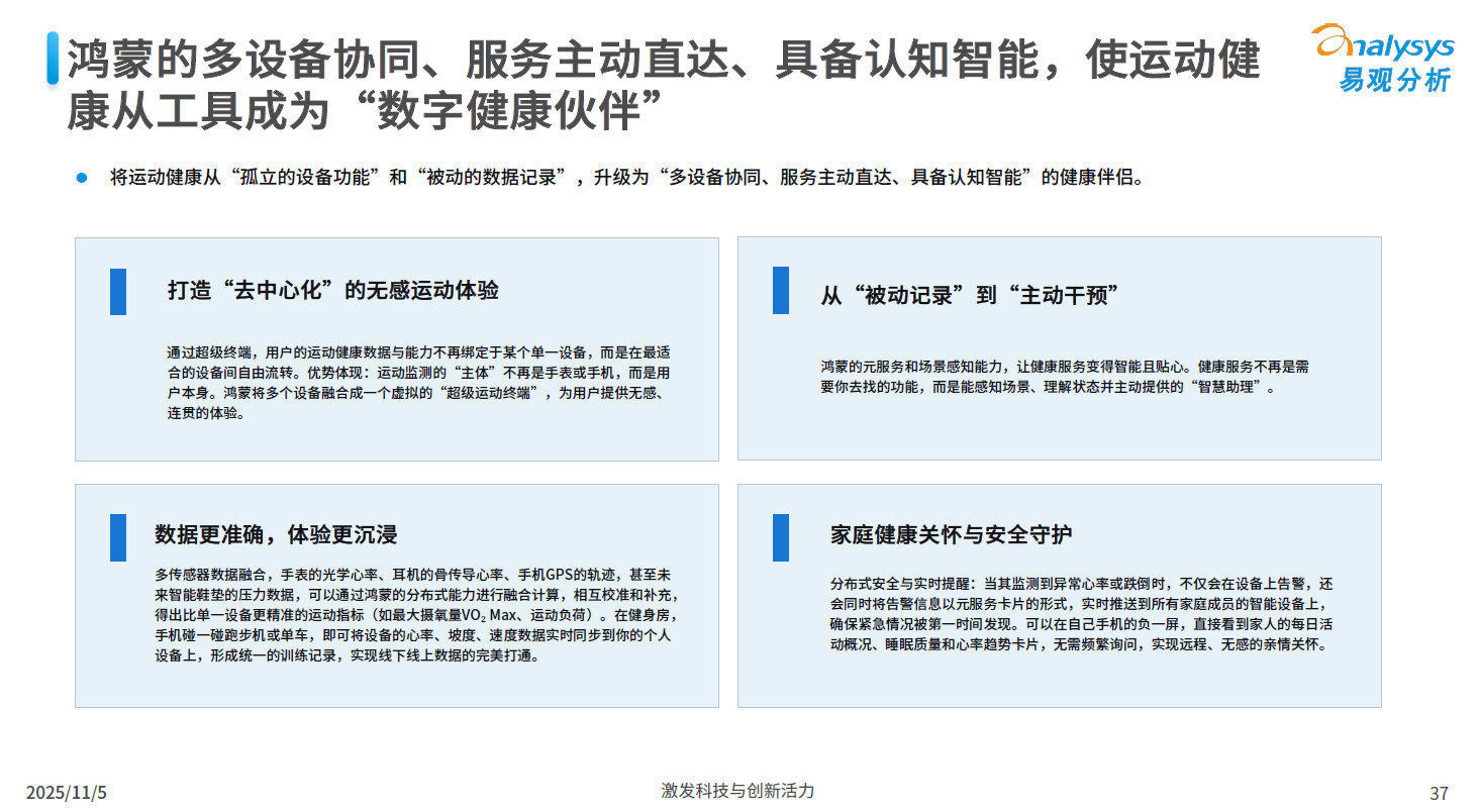 开发建议:针对医疗健康与体育文化赛道,开发者可以设计出跨设备体验。例如,在医疗健康赛道,开发应用可将手表(心率监测)与智慧屏(AI 健身指导)无缝协同;在体育文化赛道,打造应用可实现手机(数据)与智慧屏(赛况)的多屏联动,创造独一无二的用户体验。
