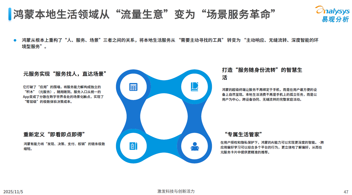 为了加速这一进程,华为已启动鸿蒙「天工计划」,投入 10 亿元专项激励 AI 生态创新,并保持每年超过 60 亿元的投入支持开发者创新。对于开发者和投资者而言,最好的时机永远是「当下」。易观报告所揭示的十大高潜力赛道,正是鸿蒙生态版图上亟待开拓的关键领域。与其在红海中消耗,不如在新生态的蓝海中启航。