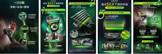 吉列极光刀精准地解决了手动剃须的几大传统痛点,例如贴合不足导致剃不净、刀片锋利度与舒适度难兼顾和皮肤敏感易受刺激等等。最终呈现给用户的,是一种高效、彻底、舒适且富有格调的剃须体验。