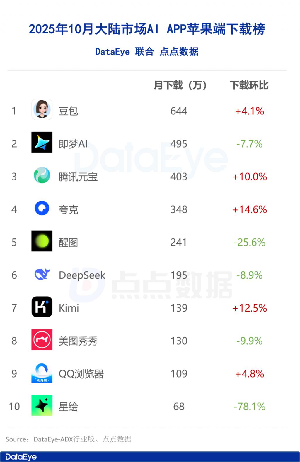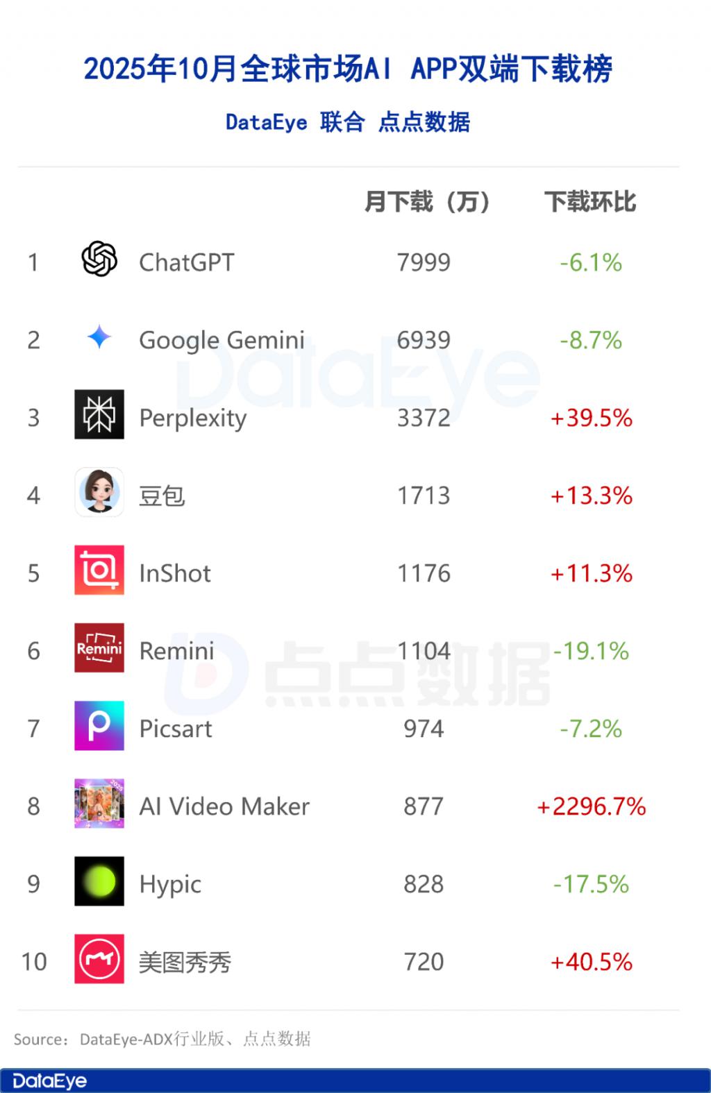 10 月 AI 月报:全球 AI 下载 4.9 亿,豆包下载量上涨