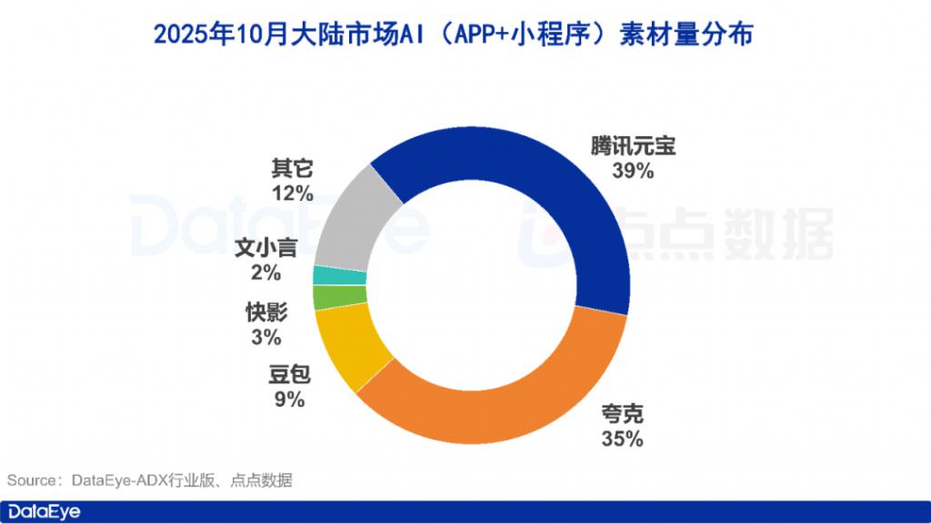 其中腾讯元宝、夸克、豆包、快影与文小言位列素材投放榜 TOP 5,这 5 款应用占据了大陆市场 AI 行业月投放素材量的 88%。