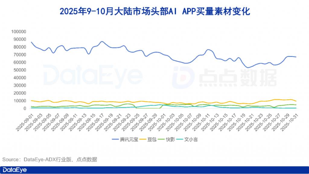 ADX 行业版数据显示,2025 年 10 月,大陆市场头部 AI APP 买量素材依旧呈现腾讯元宝遥遥领先格局,腾讯元宝以日均 7 万组左右素材量大幅领先,不过其在 10 月份素材量较 9 月份有所下滑。