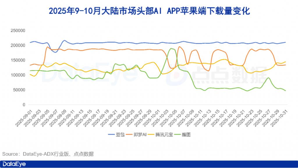 点点数据显示,2025 年 9 月至 10 月,大陆市场苹果端头部 AI APP 预估下载量豆包依旧保持领先,且日下载量持续稳定在 20 万次左右。