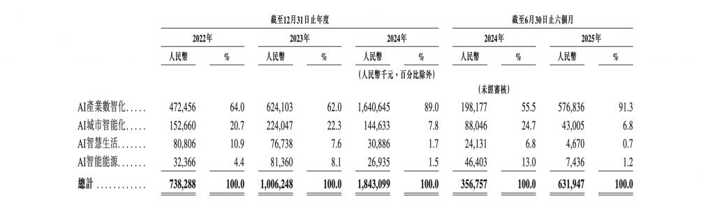 2022-2024 年及今年上半年(下称:报告期),特斯联来自 AI 产业数智化的收入分别约 4.72 亿、6.24 亿、16.41 亿、5.77 亿元,占总收入的比例分别为 64.0%、62.0%、89.0%、91.3%。今年上半年,特斯联的 AI 产业数智化业务收入同比上涨 191%,成为营收增长的全新引擎。