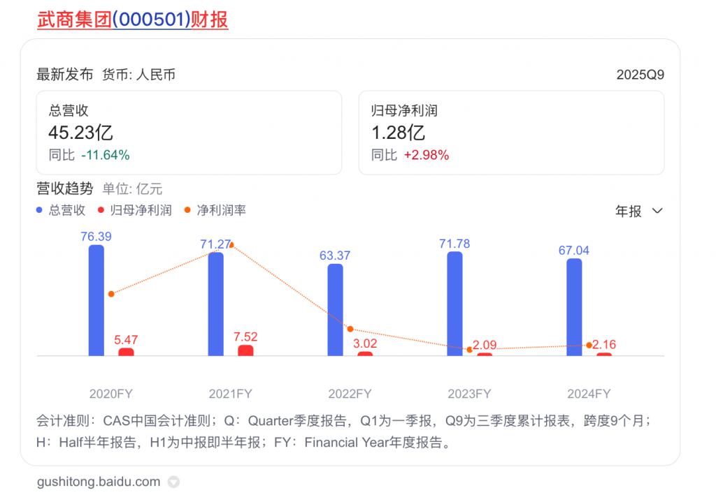 2020-2024 年,武商集团营收分别约 76.39 亿、71.27 亿、63.37 亿、71.78 亿、67.04 亿元;归母净利润分别约 5.47 亿、7.52 亿、3.02 亿、2.09 亿、2.16 亿元。今年前三季度,该公司营收 45.23 亿元,归母净利润 1.28 亿元,净利润率 2.83%。截至今年 9 月底,其总资产 310.5 亿元,净资产 109.6 亿元,资产负债率 65%。截至今日收盘,武商集团跌 3.15% 报 9.85 元 / 股,总市值 75.75 亿元。