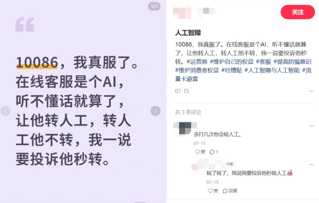 AI 客服很容易出现与用户的沟通障碍。不少网友吐槽,中国移动的在线 AI 客服 " 听不懂人话,难以交流,转人工也非常困难。"